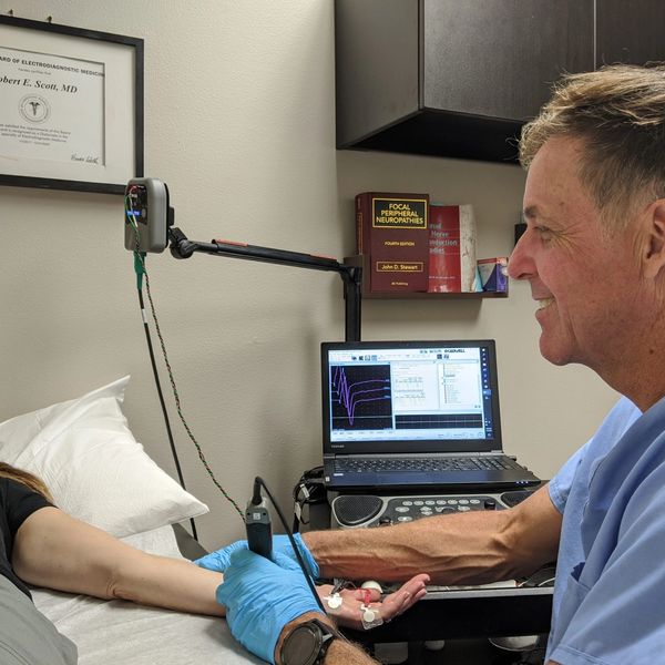 Neurodiagnostic testing, also known as electrodiagnostic testing, evaluates the physiologic function of nerves and muscles. These tests help diagnose peripheral nerve injuries, such as carpal tunnel syndrome, and spinal nerve injuries that can cause symptoms like sciatica or radiculopathy. Dr. Scott holds the highest level of training and board certifications required to perform these studies and has over 20 years of experience conducting them.